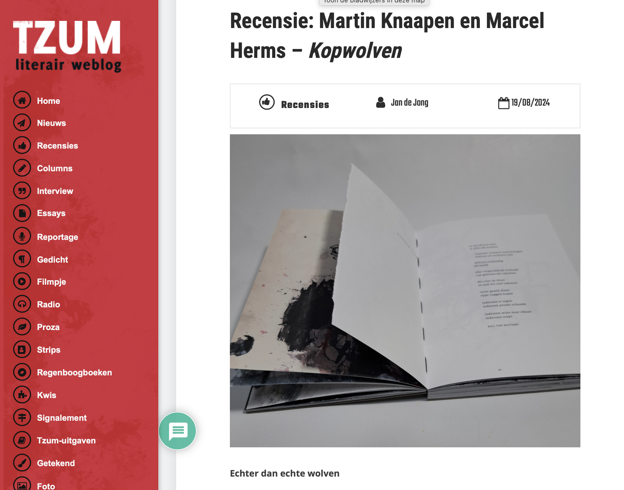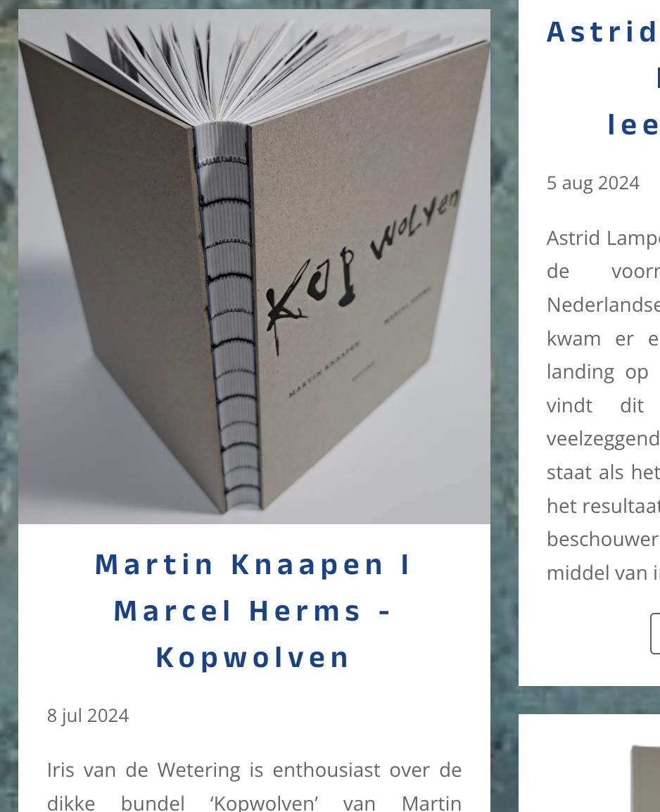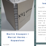 Iris van de Wetering is enthousiast over de dikke bundel ‘Kopwolven’ van Martin Knaapen en Marcel Herms: ‘Deze bundel is een introspectief onderzoek naar de dichter zijn houding en gedrag. Elk deel is een reflectie, geen absolute waarheden, maar eerder kronkels van gedachten, fragmenten van herinneringen, beelden, schetsen, van een man die een reis maakt. Herms heeft gezorgd voor abstracte, intense, illustraties die verschijnen na elk gedicht.’